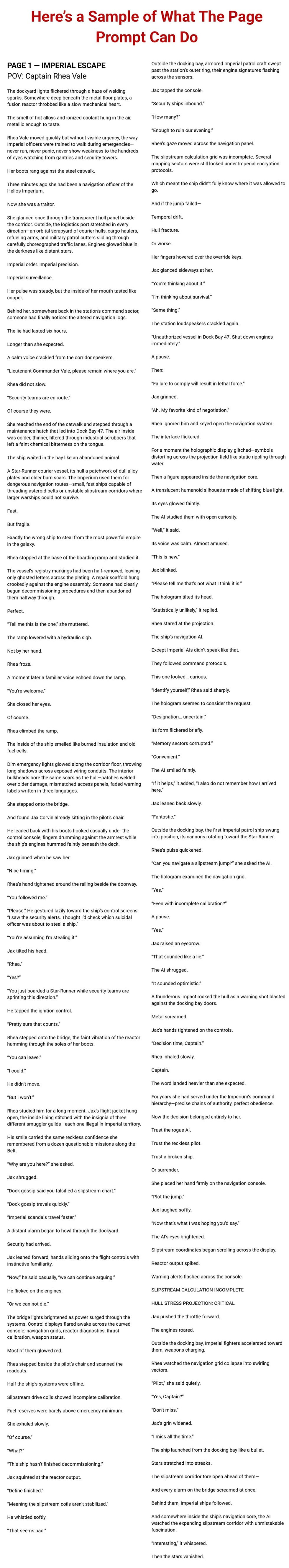 After that, I started using the Page Prompt to generate scenes one by one. The system guided the AI to include dialogue, character conflict, and realistic technology limitations, which made the story feel less generic compared to some AI-generated writing I’ve seen before.
