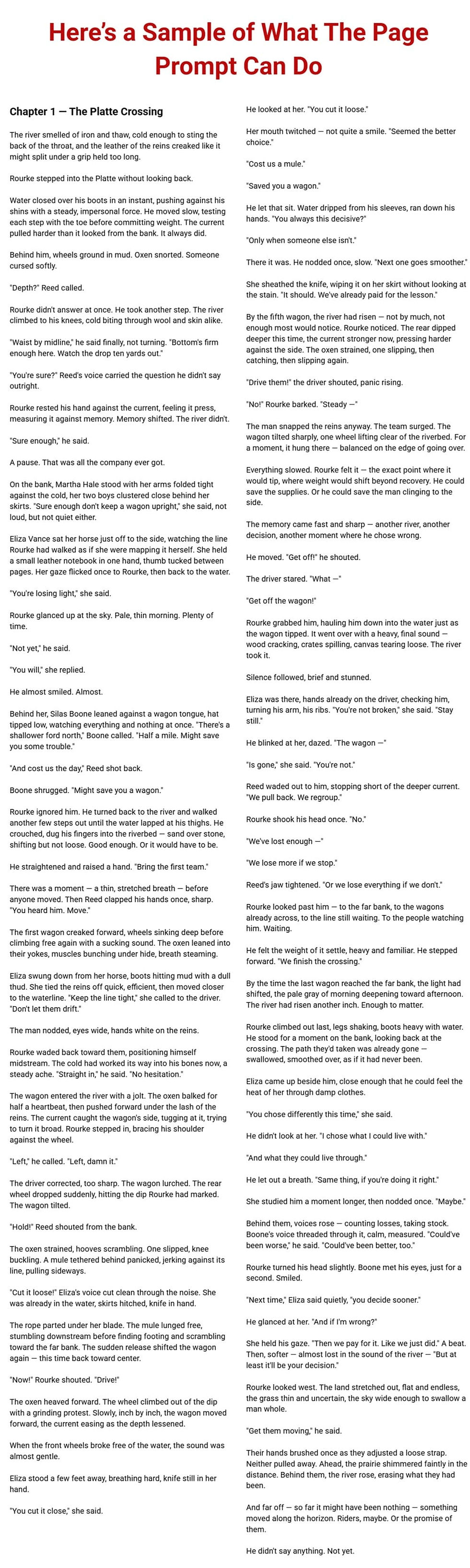 Drop in the Book Prompt: Get 13-chapter outline, killer title, pro cover prompt.Hit Chapter Prompt: Cranks out 1,500+ word scenes—lush, emotional, continuity-perfect.