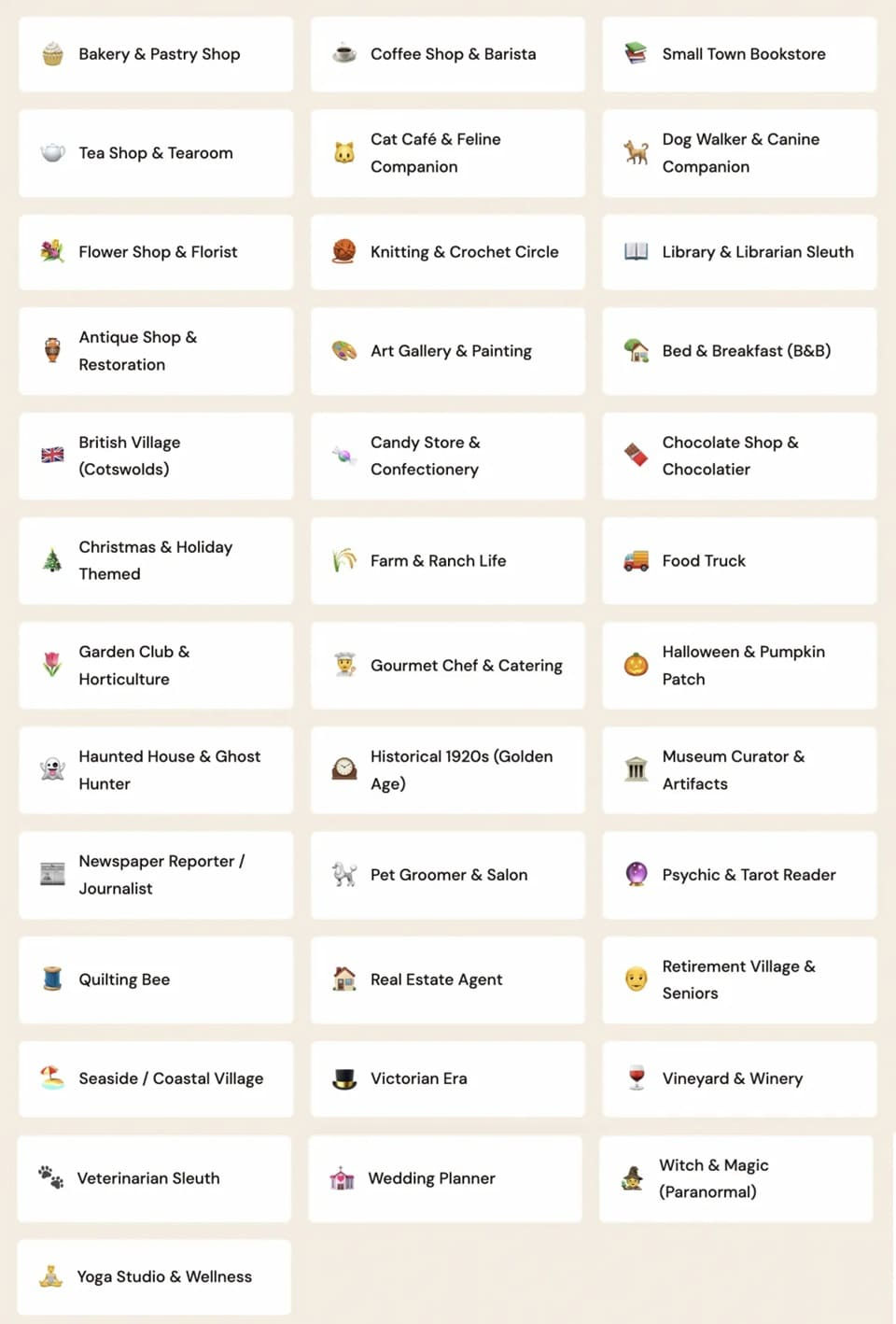 ✅ Coverage Across 37 Cozy Mystery Subgenres