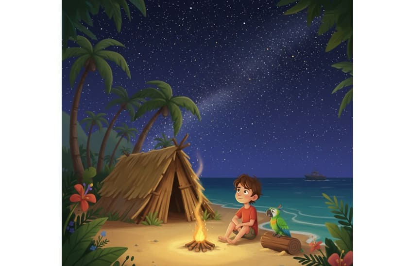 The First Mission: Finding Water Leo’s throat felt scratchy and dry. He remembered a book he’d read about the jungle: Where there are green, leafy plants, there is usually water. He stepped carefully into the shade of the trees. He moved slowly, his eyes scanning the ground just like the "observant" boy he was. Suddenly, he saw a cluster of bright orange flowers leaning toward a mossy rock. Behind it, a tiny trickle of water dripped into a stone hollow. He tasted it—cool, clear, and fresh. Leo took a long drink and felt a spark of confidence. "Observation number two," he whispered, wiping his mouth. "I can find what I need if I just look closely." A Sudden Friend “KRR-AAK! Look closely! Look closely!” Leo jumped, his heart racing. Sitting on a low branch was a parrot with feathers the color of a lime and a sunny yellow belly. The bird tilted its head, looking at Leo with one shiny black eye. "Oh! You scared me," Leo laughed, his shoulders finally relaxing. The parrot didn't fly away. Instead, it hopped down to a lower branch and gave a soft whistle. Having a friend—even a feathered one—made the island feel a lot less lonely. "I'm Leo," he said. The parrot bobbed its head as if to say, Nice to meet you. Building the "Sand Castle" House As the sun began to dip lower, painting the sky in streaks of violet, Leo knew he needed a place to sleep. He found a spot where two palm trees grew close together. Using his problem-solving skills, he gathered: Long, fallen branches to lean against the trunks. Wide, flat palm fronds to weave together like a giant green blanket for the roof. Dry seagrass to make a soft, springy floor. It wasn't a palace, and it was a little crooked, but when he crawled inside, it felt sturdy. He had a roof over his head and a fresh drink of water in his belly. Leo sat at the entrance of his new shelter, watching the first stars blink into view. He was still a long way from home, but as the parrot tucked its head under a wing nearby, Leo realized something important: He wasn't just surviving—he was Figuring It Out. |