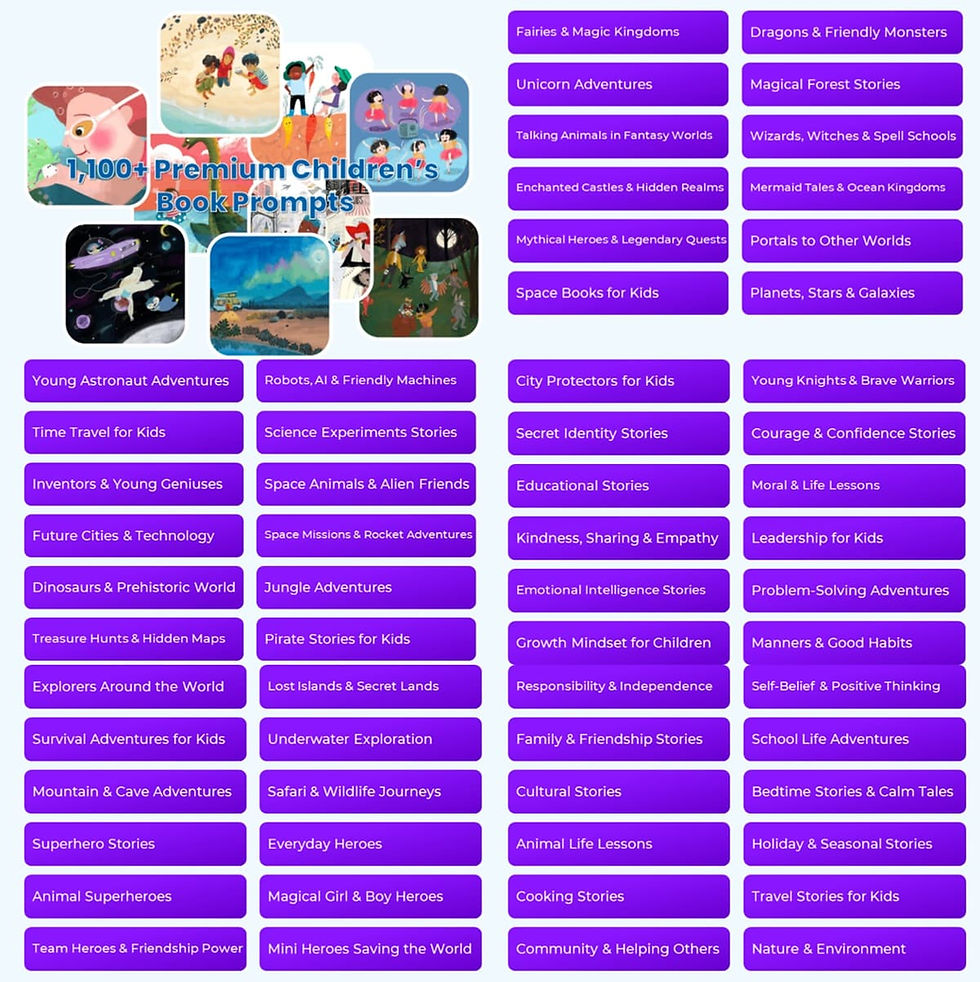 ✅ Massive Library of 1,100+ Children’s Book AI Prompts
